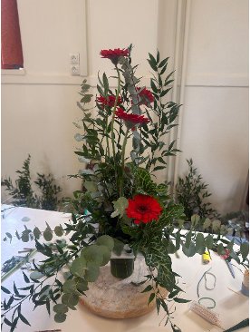 Avec sa grande expérience - 25 ans d’activité dans les associations d’art floral, et beaucoup d’années de formation, Annie Lerebour nous a indiqué pas à pas la construction du bouquet en nous fournissant tous les matériaux, Dans une église, elle commence toujours par observer les lieux, de quel style est l’église, de quelle époque. En fonction de la grandeur des lieux et de l’emplacement, elle conçoit le bouquet qui doit s’intégrer harmonieusement à l’architecture et au mobilier de l’église.