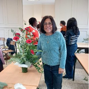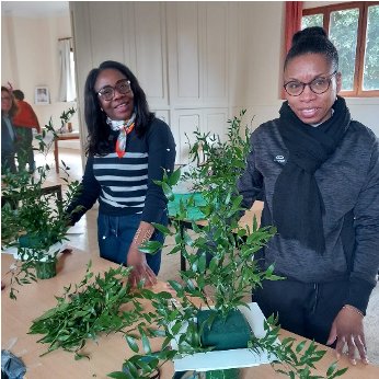 Nous avançons dans la conception de notre composition grâce aussi aux conseils et aide de ses charmantes collaboratrices Aissata, Murielle Matin, Hélène Potier, membres de l’équipe de la liturgie sacramentelle et nous avons pu admirer enfin en début d’après-midi nos œuvres terminées. Nous sommes fières d’avoir pu aller jusqu’au bout de cette création. Chacune est repartie avec le sourire et sa composition….