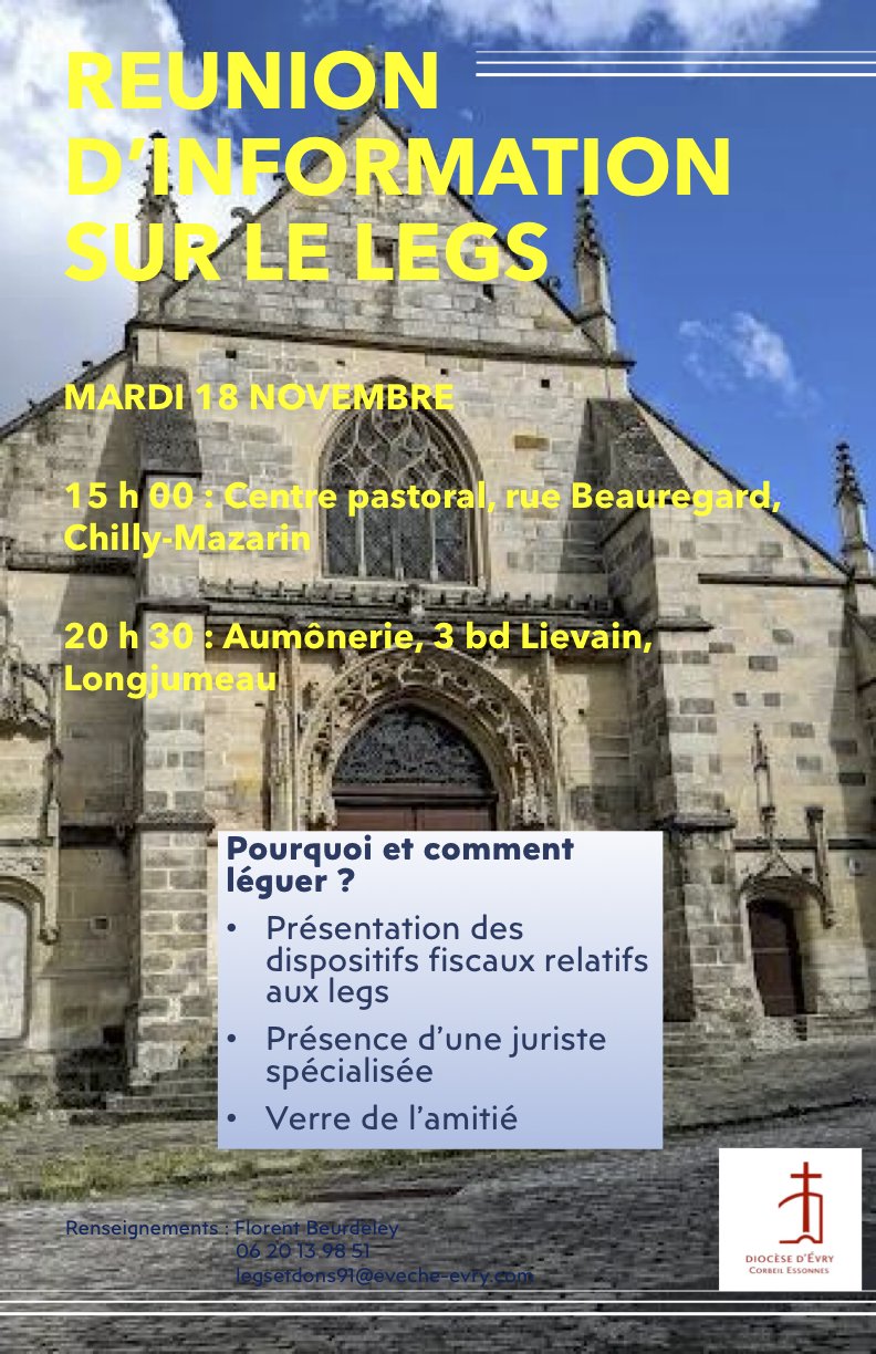 Le Diocèse d’Évry organise dans notre secteur des réunions d’information portant sur le thème des legs et des donations... Il existe plusieurs façons d’aider l’Église, tout en bénéficiant d’avantages fiscaux souvent méconnus, sans léser vos héritiers.