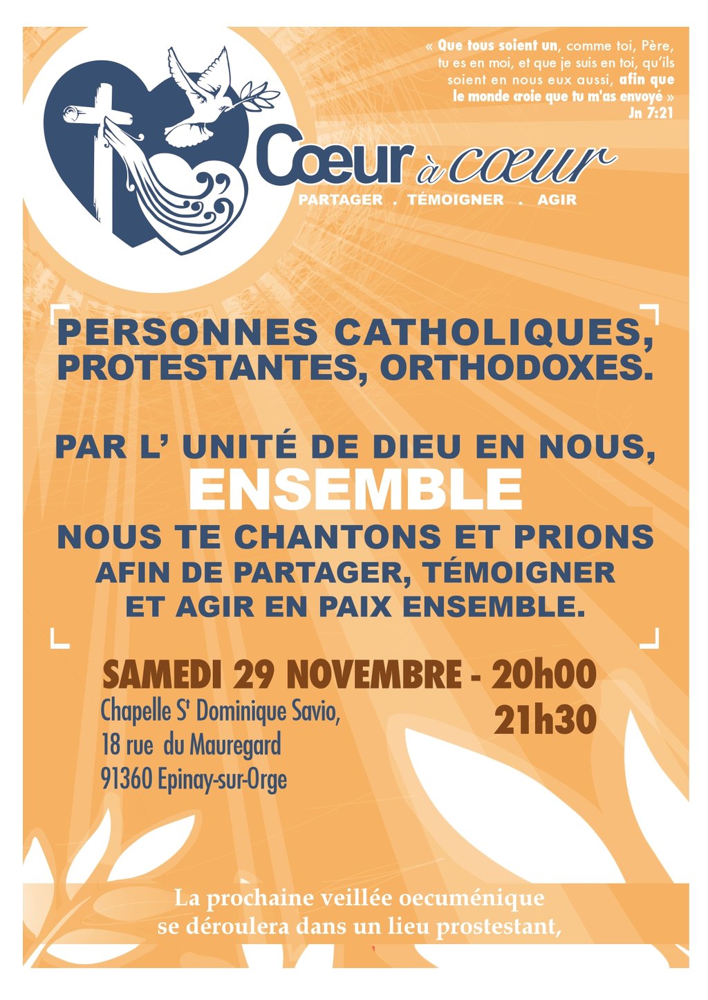Veillée de partage, témoignage et prières pour l'unité des chrétiens de personnes catholiques, protestantes et orthodoxes (programme ci-dessous 👇).